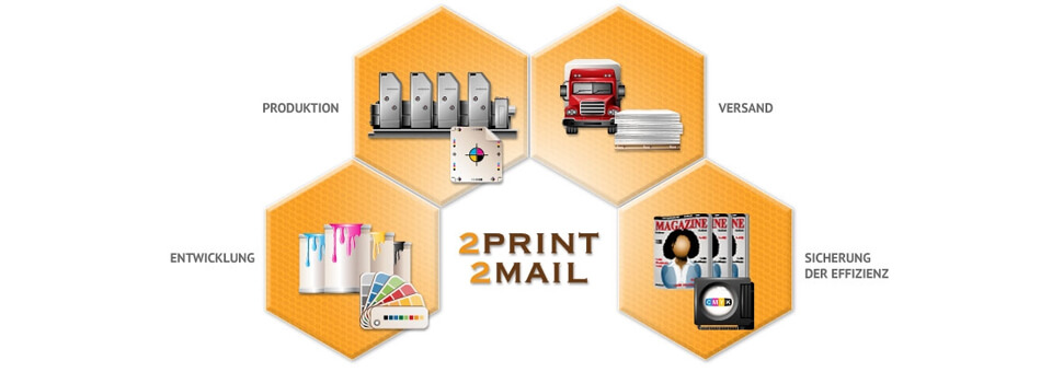 2Print2Mail ist das professionelle Bindeglied zwischen der Entwicklung (Werbeabteilung/Redaktion), der Produktion (Druckerei) und des Versandes (Lettershop) eines Printobjektes und sichert so die Effizienz und Qualität in allen Produktionsphasen.